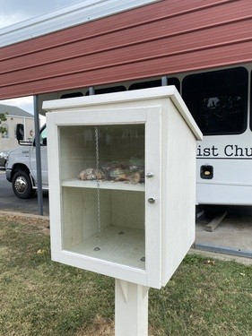 A Blessings box provides free food to those in need in our community. It is located on the north side of the property along College St.